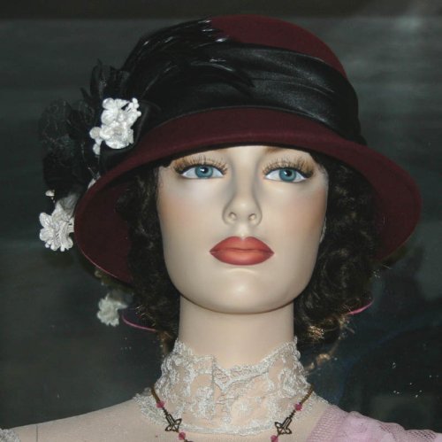 The photos have been lightened so you can see the detail of the black embellishments.Edwardian and Victorian Style Hats, Titanic Hats, Bonnets and Flapper Style Hats designed by Darna's East Angel Harbor Hat Shoppe are influenced by the hats of the Victorian and Edwardian Eras as well as the 1920's and I embrace the finery of these eras to design my re-creations. My hats are designed for Victorian, Civil War, Edwardian, Titanic and Roaring Twenties re-enactment, tea hats for parties as well as church. I'm dedicated to designing Victorian and Edwardian and flapper style hats and accessories that have both an element of realism combined with imagination; my hat designs transcends time and I truly want to enchant you and assist you on your journey to somewhere in time!"Lady Shannon" flapper hat is a darling cloche hat made of burgundy wool felt. This little cloche hat perfect to wear with your winter coat, to church or wedding or even to a flapper event. The cloche hat style is ageless and just a popular today as it was in the 1920's. Cloche is French for Bell; thus the bell shape. The embellishment is a black satin hat band & ribbon bow; a black velvet and organza rose with black velvet leaves and ivory velvet lilacs; accented with a spray of black coque feathers. A very classy and elegant cloche hat!